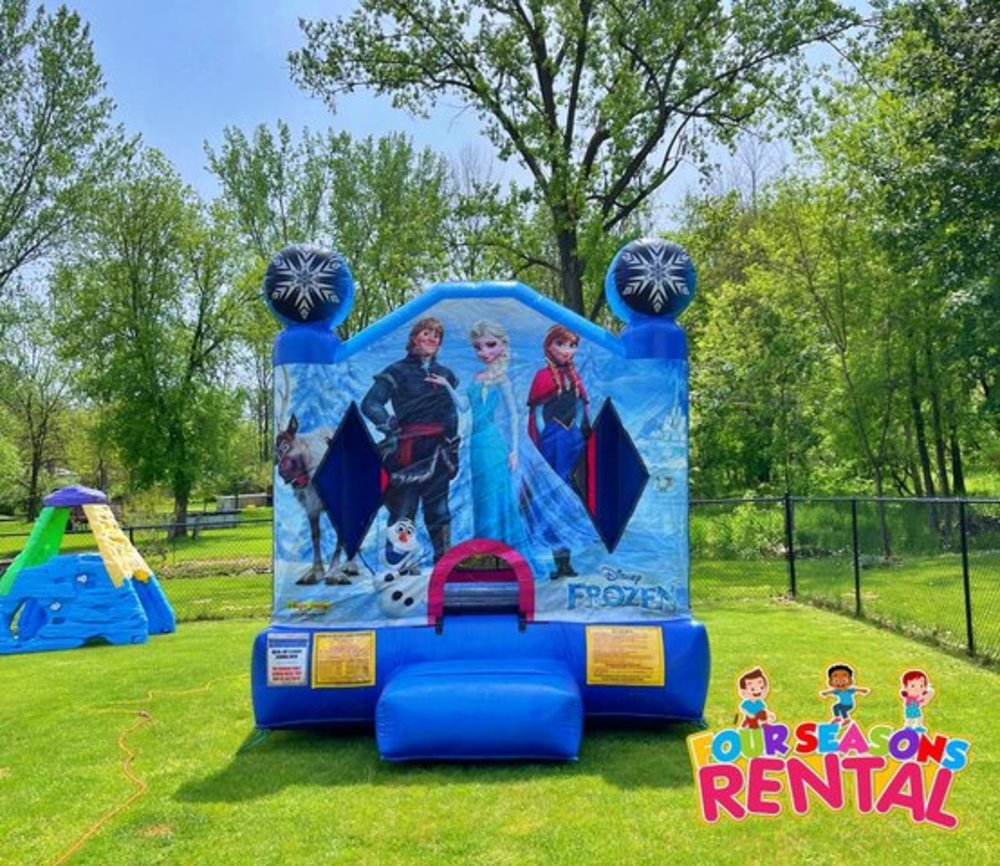 Since its release in 2013, Frozen has been an unmistakable hit with children all over the globe! At Four Seasons Rental, located in Newark, New York, we have a GIANT eleven foot by eleven-foot frozen theme jumper which is almost guaranteed to make you ask yourself, “do you want to build a snowman?” Printed in beautiful, vivid, and dynamic color on the front of this jumper are all of your little one’s favorite characters. Ana and Elsa are joined by their friends Kristoff, Sven, and Olaf! The jumper features a ramp that inflates and is connected to the main structure making entry and exit safe for partiers. Mesh panels ensure proper airflow helping to keep you cool while jumping the day away! Four Seasons Rental offers delivery and set up of all jumpers making your job as a party planner a little easier. Jumpers are able to be set up outside or inside providing there is adequate space. Jumpers are secured in the outside setting with multiple steel stakes driven deep into the ground, inside settings utilize sandbags ensuring a safe and fun environment for all guests. The blowers used to inflate the jumpers run on standard 120-volt power making them usable at almost any backyard party or event. Four Seasons Rental is Conveniently located in Newark, New York and services all of Wayne, Monroe, Ontario, Seneca, and Cayuga Counties. Call now and book the Frozen Jumper for your next event!